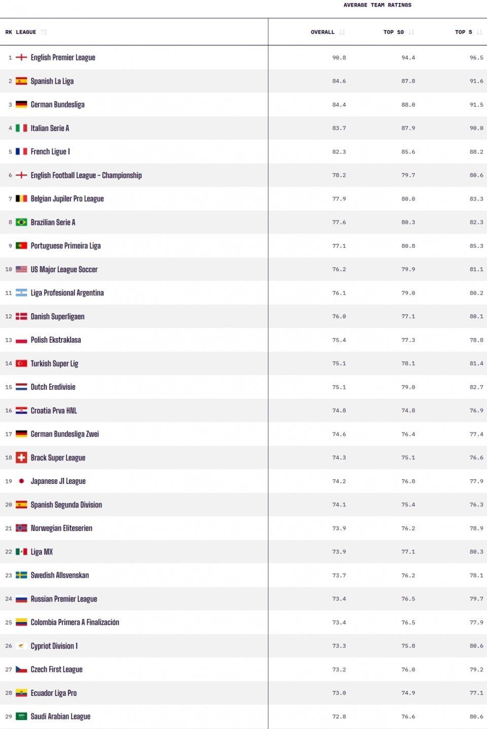 值得注意的是,英格兰第2级别联赛“英冠”联赛在这份榜单中表现抢眼,竟然位居第6位,力压比甲、巴甲、葡超等其他传统足球强国的一级联赛。这一结果无疑让许多球迷感到意外。而梅西所效力的美职联,则排名第10位,显示出其在全球足球舞台上的竞争力。