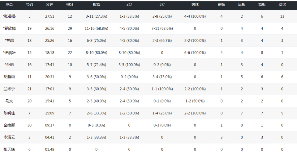 纵观全场比赛,江苏女篮全队5人得分上双,表现抢眼。其中,罗欣棫16投11中,砍下29分,并命中7记三分,成为球队获胜的最大功臣。张曼曼贡献12分13助攻,黄琨得到16分,许晨妍砍下22分8篮板,孙丽也有10分入账。