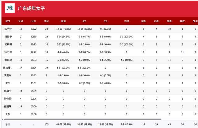 从数据上看,广东全运女篮实力强大,投篮命中率高达56.6%,而湖北队命中率只有35.8%,差距一目了然。广东队多达6人得分上双,陈明伶得到24分10篮板,杨舒予22分7篮板5助攻,杨力维10分4篮板11助攻,武桐桐16分8篮板6助攻,黄思静15分11篮板6助攻,迪拉娜10分3篮板。而湖北队只有2人得分上双,彭华倩13分7篮板,刘贝11分3篮板4助攻。
