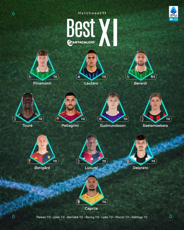 以下是意甲第11轮最佳11人阵容的详细名单: