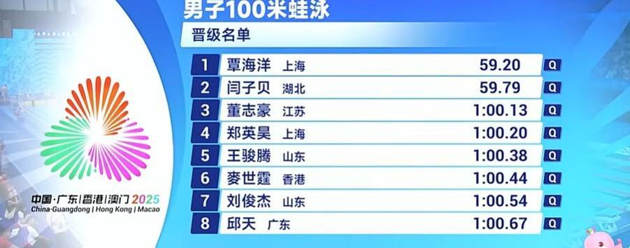 11月10日,全运会男子100米蛙泳半决赛迎来激烈角逐。该项目亚洲纪录保持者覃海洋发挥出色,以59秒20的成绩排名小组第一、总成绩第一,顺利晋级11日晚间19点进行的决赛。