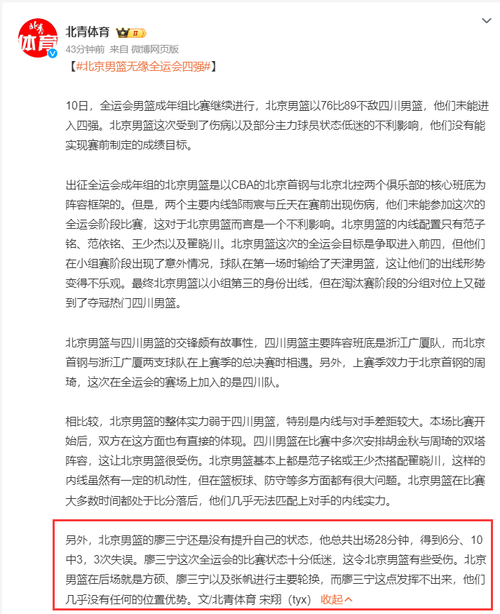 对阵四川的比赛,廖三宁依然没有找到状态,10投3中,三分球2投0中。这一次,《北青体育》记者宋翔终于忍不住,对廖三宁展开了猛烈批评。