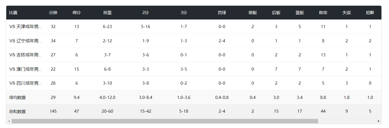 场均29分钟,拿到9.4分8.8助攻3.4篮板1抢断1.8失误,命中率33.3%,三分命中率27.7%。五场比赛60投20中,三分球18投5中,狂打40铁,这样的表现,应该是一个国家队后卫的水准吗?