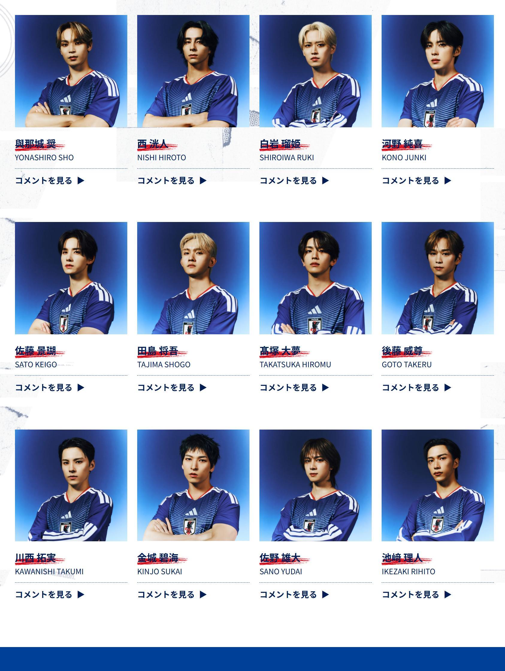 此次担任大使的特别组合名为“JI BLUE”,由JO1与INI两支男团中热爱足球的12名成员组成。成员名单包括与那城奖、西洸人、白岩瑠姬、河野纯喜、佐藤景瑚、田岛将吾、高塚大梦、后藤威尊、川西拓実、金城碧海、佐野雄大及池崎理人。这支跨团组合将通过音乐创作、线下活动及社交媒体互动,全方位支持日本国家队备战2026年国际赛事。