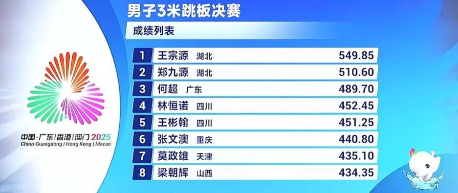 11月10日,全运会跳水男子3米跳板决赛在万众瞩目中拉开帷幕。作为奥运会和世锦赛的双料冠军,王宗源在赛场上展现出了强大的统治力,从首轮比赛开始便一路领先,最终以549.85分的绝对优势轻松摘得金牌。这不仅是王宗源在本届全运会上的第二枚金牌(此前已夺得1米板冠军),更是他实力与状态的完美诠释。与此同时,另一位湖北选手郑九源以510.60分获得银牌,广东队老将何超则以489.70分摘得铜牌。