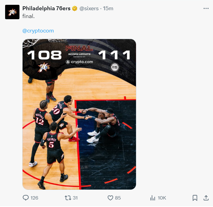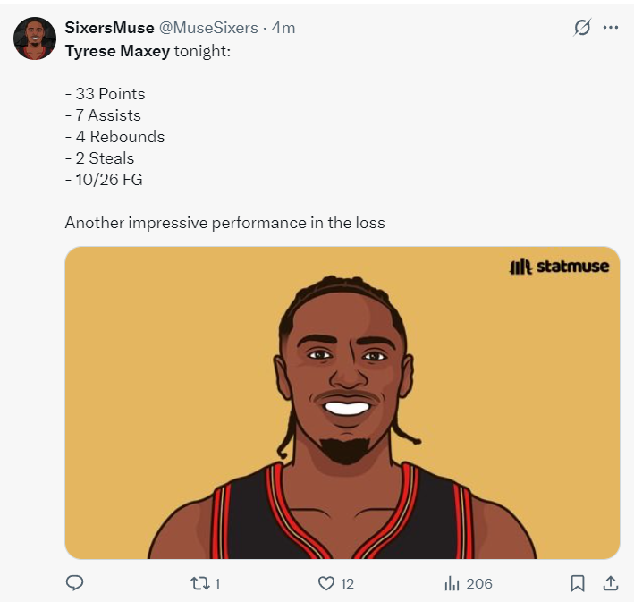全场比赛,马克西出战38分钟,26投10中,三分12中4,罚球9中9,砍下33分7助攻4篮板2抢断的全面数据。尽管命中率38.5%、三分命中率33.3%不算高效,但末节独得15分的表现证明其关键时刻的得分能力。在恩比德、乔治缺阵的情况下,马克西独自扛起球队进攻大旗,而埃奇库姆、格兰姆斯等队友表现低迷。