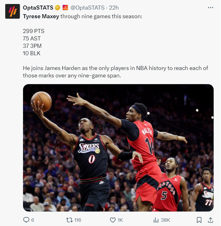 美媒统计显示,马克西新赛季前10场比赛已狂揽332分83助攻50篮板,场均33.2分的表现堪称现象级。这位上周的东部周最佳球员,正以“新艾弗森”的姿态引领费城前行。其前9场比赛拿到299分75助攻37记三分球10次盖帽,成为哈登后首位达成此数据的球员。