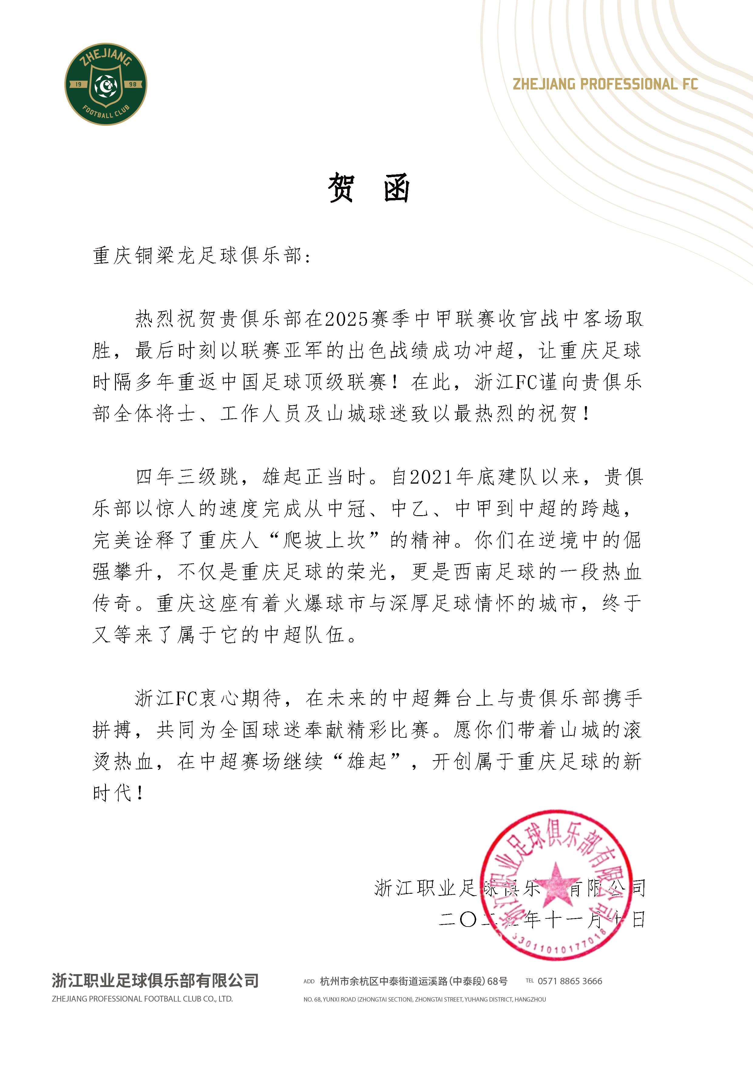 浙江职业足球俱乐部在贺函中特别强调:“祝贺重庆铜梁龙与辽宁铁人成功冲超,2026中超赛场我们不见不散!”这一表态既展现了对同行的尊重,也透露出对未来中超联赛竞争格局的期待。