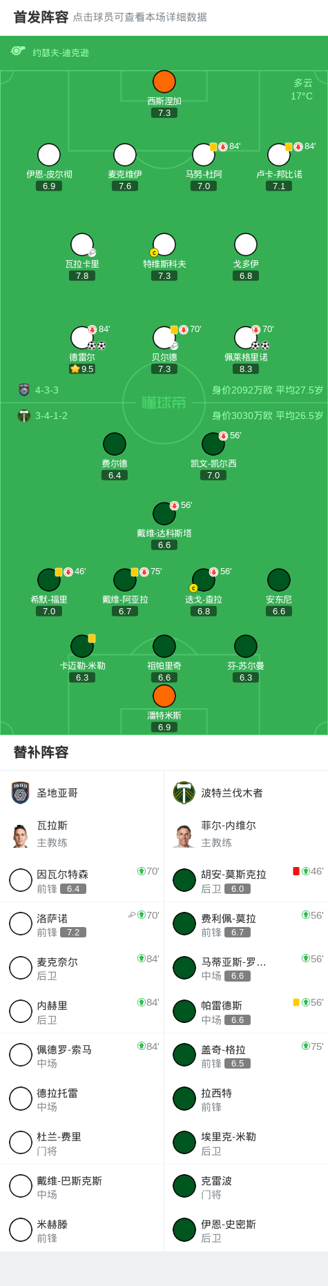 本场比赛圣地亚哥采用4-3-3阵型,通过边路传中与中路渗透相结合的战术,彻底压制了对手。佩莱格里诺与德雷尔的锋线组合堪称完美,两人不仅个人能力突出,更通过默契配合多次撕开对方防线。而波特兰伐木者则因少打一人,全场未能组织起有效进攻,最终吞下失利苦果。