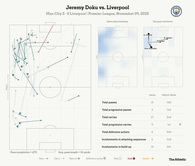 北京时间11月10日,英超第11轮迎来一场焦点大战,曼城在阿提哈德球场以3-0完胜利物浦。赛后,权威体育媒体The Athletic发表专题文章,对本场比赛进行了深度分析与点评。以下为详细报道。