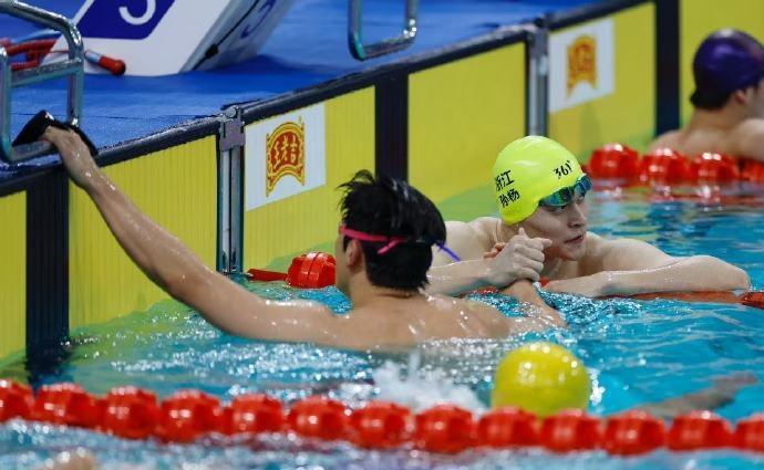预赛结束后,一个温馨的画面出现在了泳池边。潘展乐与孙杨在泳池中握手致意,这一举动不仅体现了两位选手之间的友好与尊重,也传递出了体育精神的真谛。