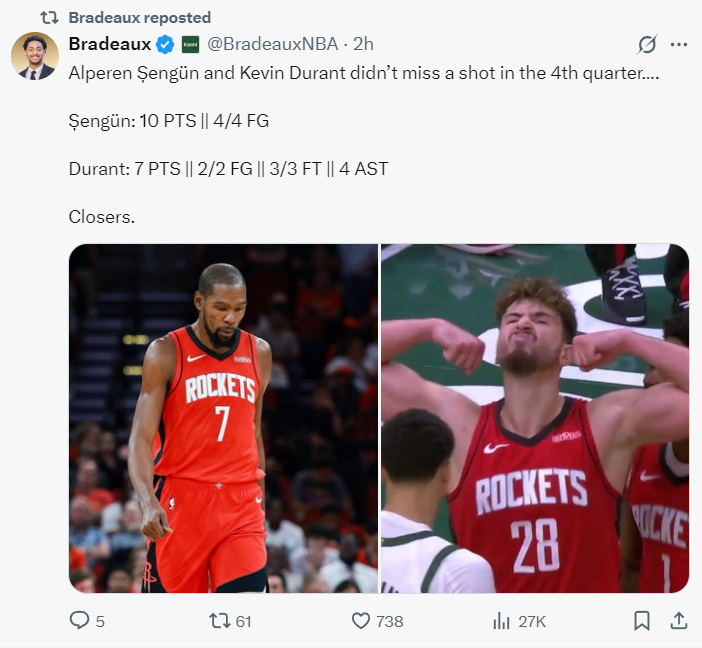在比赛的末节,申京展现出了惊人的效率,他4次出手全部命中,独得10分。相比之下,尽管杜兰特也表现出色,2中2加上罚球3中3拿到7分4助攻,但申京的关键表现显然更为耀眼。虽然杜兰特全场砍下30+,但最关键的一球,却是由申京亲手打进。
