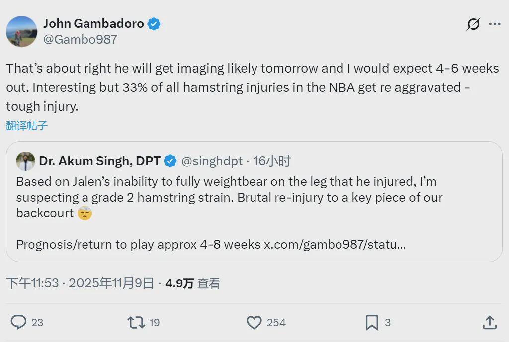 对于杰伦-格林这样一位以爆发力著称的球员而言,腿筋的反复受伤无疑是一个沉重的打击。据ESPN进一步报道,杰伦-格林在训练营期间便首次遭遇了腿筋伤势,而在季前赛期间,伤势更是进一步加重,导致他缺席了本赛季前8场常规赛。这一系列的伤病困扰,无疑让球迷们对他的未来充满了担忧。