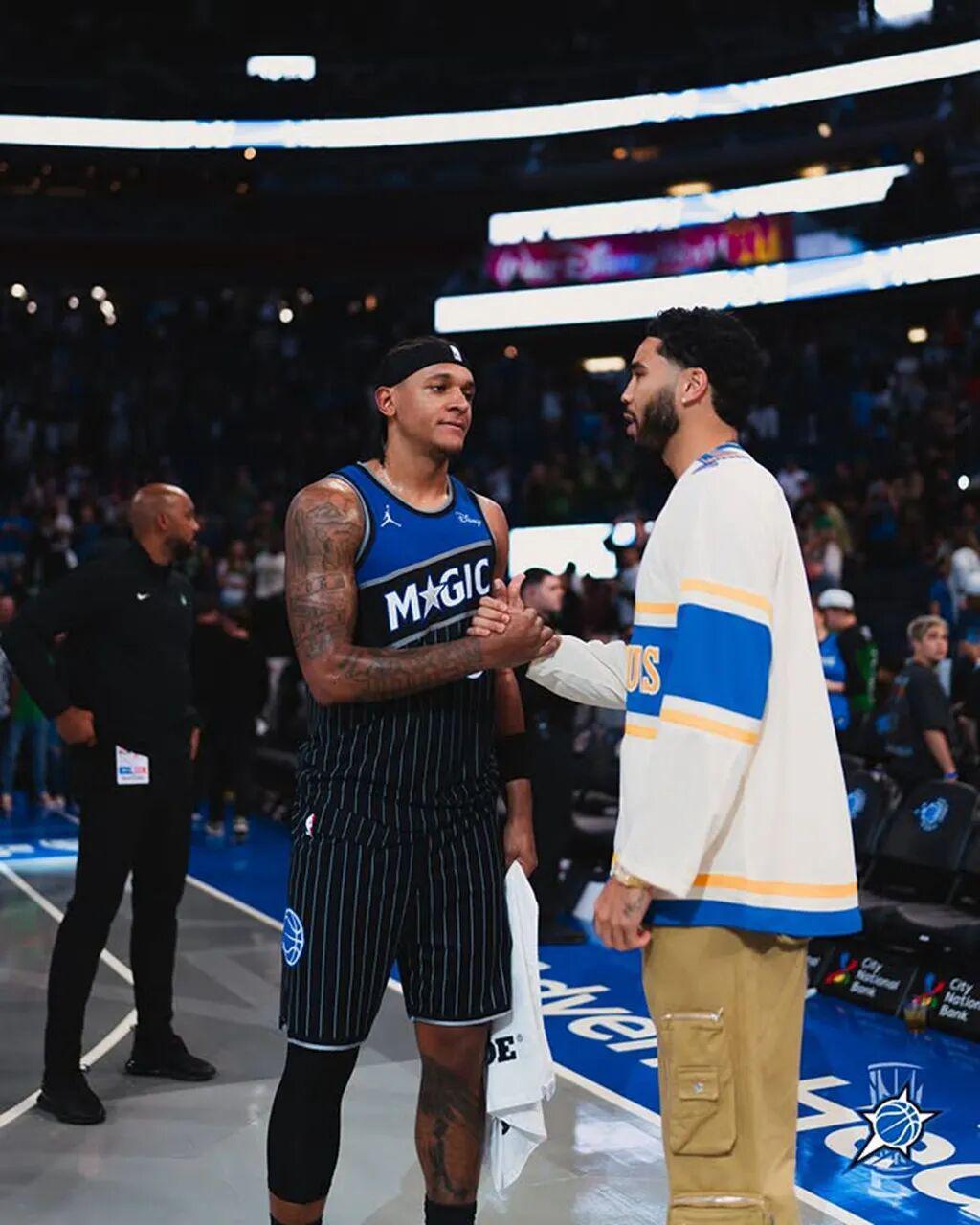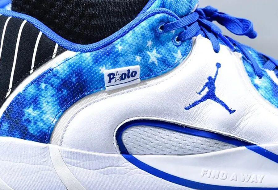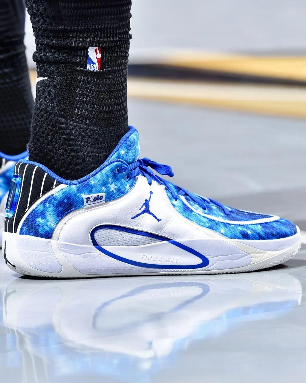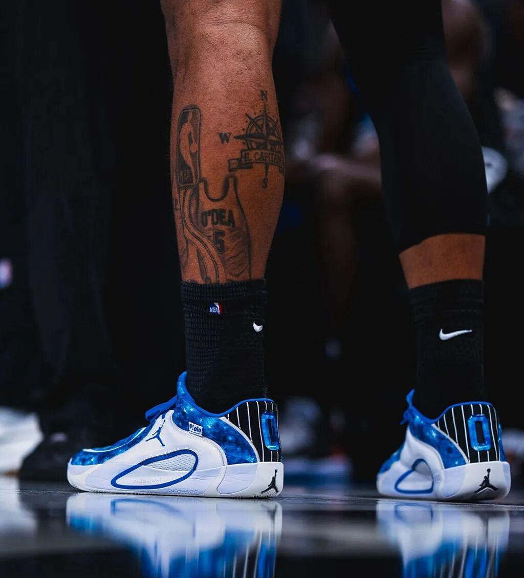 班凯罗脚上穿的,是一双专门为他量身打造的Jordan Tatum 4 PE。这双战靴的设计灵感来源于被誉为“史上最帅球衣”的魔术复古星条纹球衣,不仅配色经典,更在细节处彰显了魔术队的独特魅力。球鞋上还以魔术复古队标字体呈现了班凯罗的名字,这样的设计无疑让这双PE战靴成为了开赛以来的热门之选,甚至有媒体称其为“开赛以来最佳PE”。