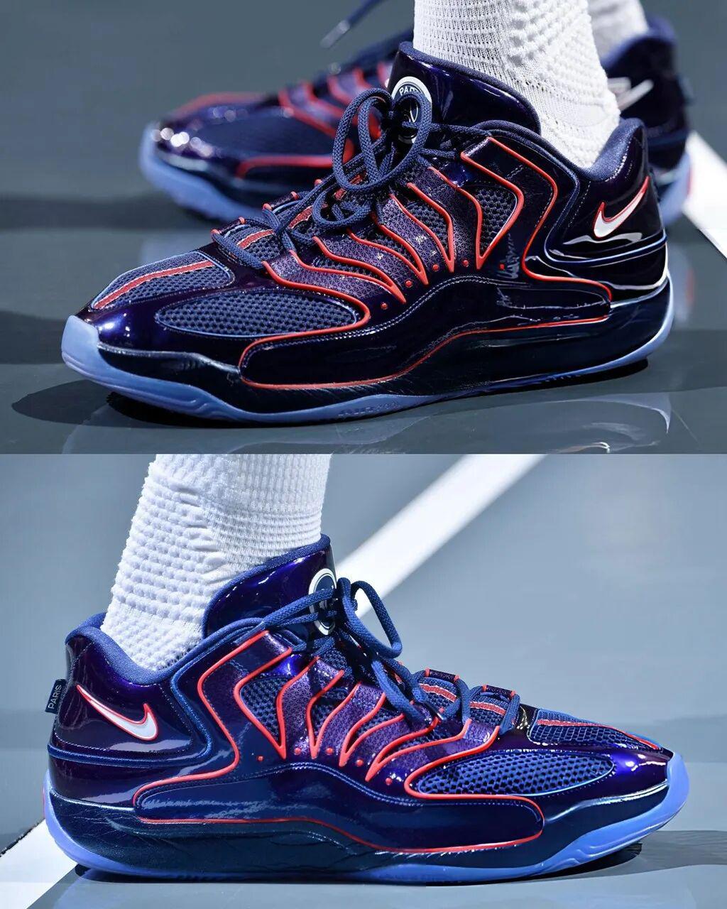 然而,这双班凯罗的PE战靴并非没有竞争对手。近期,杜兰特上脚的PSG x Nike KD18同样吸引了众多球迷的目光。这双战靴不仅配色亮眼,更在细节处下足了功夫。从杜兰特的背号到大巴黎队标,每一处设计都充满了诚意与创意,让人不禁感叹这双鞋的超高规格与高级感。