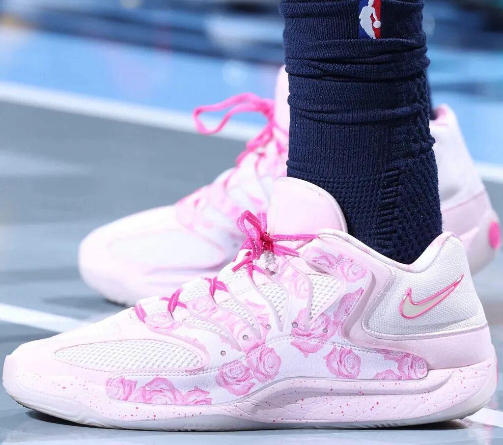 首先是奥利维耶-马克桑斯·普罗斯珀,他上脚的是Nike KD18 “Aunt Pearl”。这双战靴以粉色为主色调,充满了温馨与爱意,让人不禁为这份独特的情感所打动。