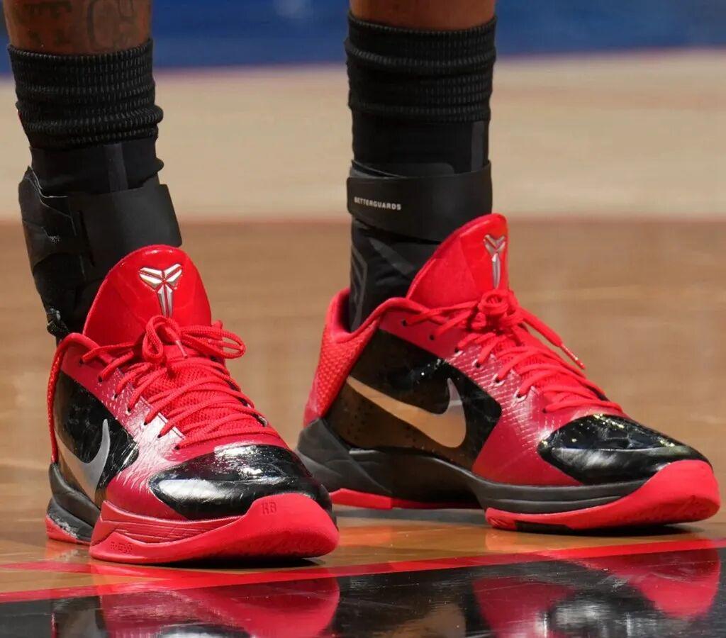 最后是贾斯汀·爱德华兹,他上脚的是Nike Kobe 5 Protro 阿里扎 PE。这双战靴以经典的黑金配色为主,彰显了爱德华兹的霸气与实力。