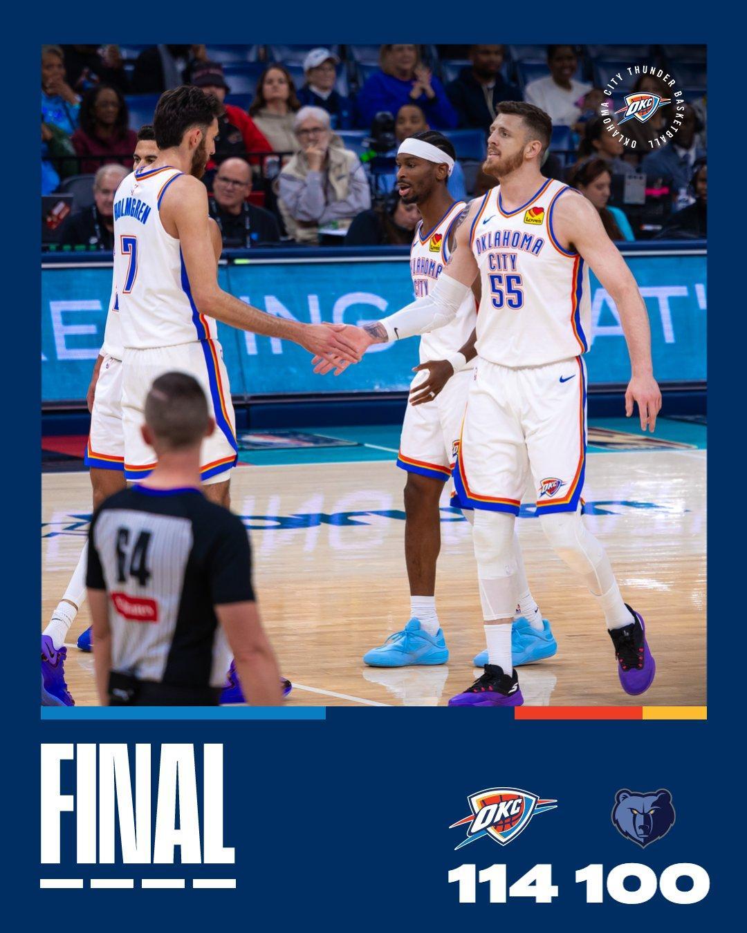 第4节,两队陷入鏖战,比分紧咬。关键时刻,亚历山大挺身而出,一人连得9分,率队取得两位数领先,雷霆得以锁定大局。灰熊追分乏力,最终,OKC以114比100完胜对手,上演了19分逆转好戏。