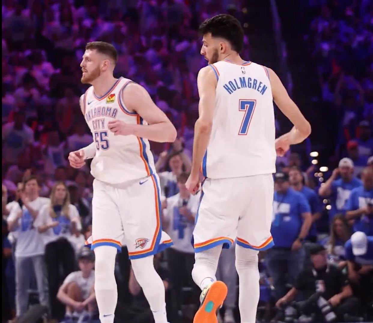 霍姆格伦与哈尔滕施泰因合力砍下了39分20板,率领雷霆在内线得分上以56比32碾压对手,这是OKC能够逆转取胜的关键。