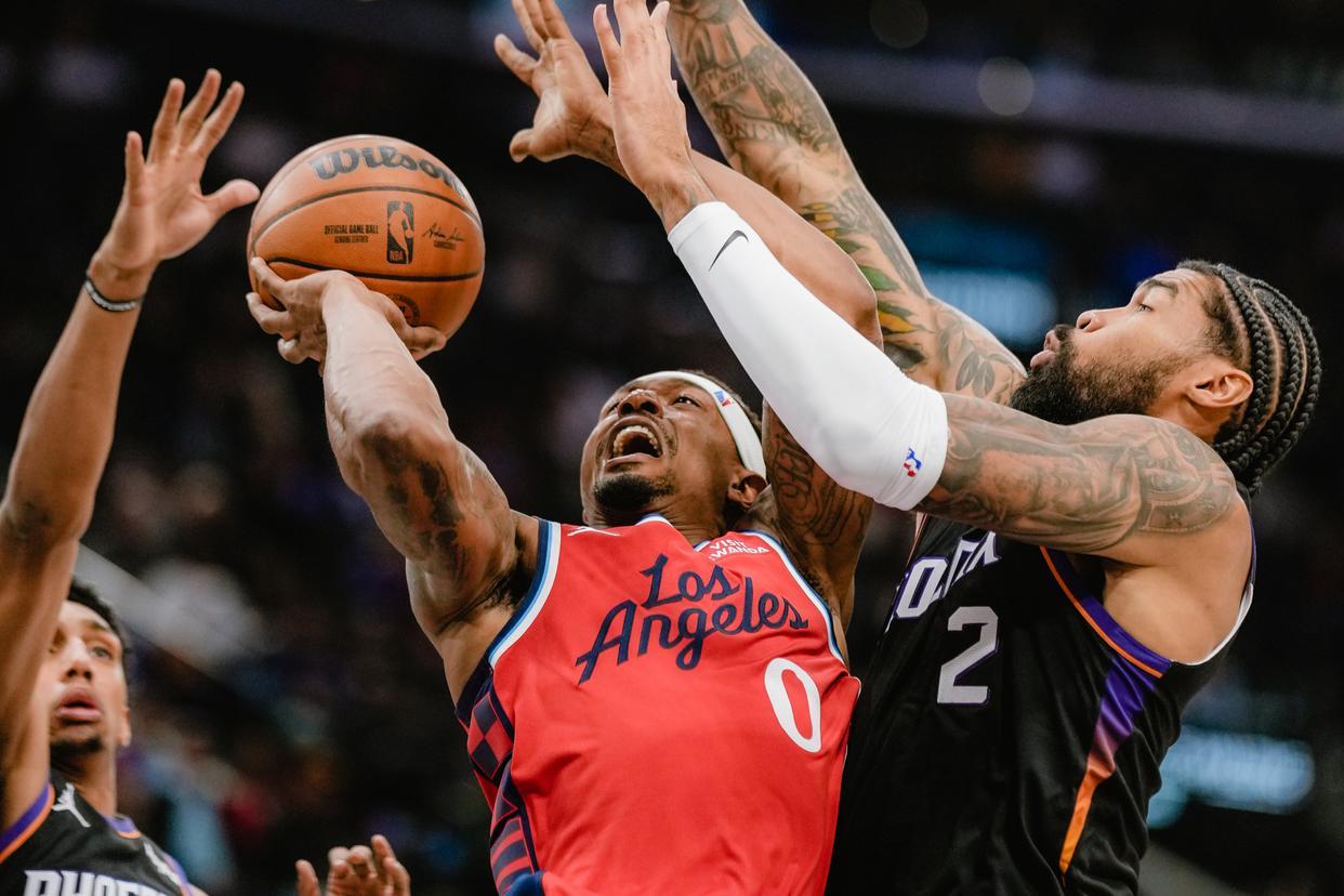 而谈到复出,快船队今天也更有话说。布拉德利·比尔再次复出,这一次再战旧主,他能否横扫上一场的阴霾?答案是否定的。甚至比赛刚开始的时候,比尔接球上空篮,一脚地板油没放进,显得更加尴尬。全场仅得12分,在菲尼克斯丢的脸,在洛杉矶又丢了一遍。带病出战的哈登只能化身生产队的驴,但看着场上的比尔,看着场下穿着休闲卫衣的伦纳德,哈登也是一肚子苦水。好在,替补席上的柯林斯联手祖巴茨守住了禁区,老将巴图姆也连续命中三分,帮助快船队在关键时刻没有沉入海底。然而,太阳队的三分雨实在太过夸张,快船队最终无奈再次败下阵来,以114-103被太阳双杀。
