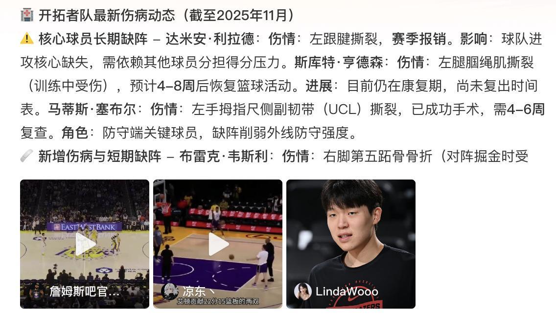 近期开拓者已出现伤病潮,轮换球员塞布尔和韦斯利因伤缺阵,归期未定。更严峻的是,核心球员亨德森和利拉德预计整个赛季报销,下赛季才能复出。球迷批评斯普利特为保合同强行追求成绩,导致球队长期发展受损,阿夫迪亚和克林根等首发也可能因高强度比赛出现伤病。
