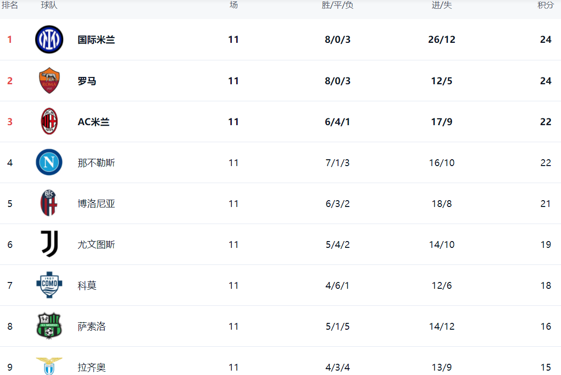 意甲联赛第11轮激战正酣,多场焦点对决引发球迷热议。本轮比赛过后,积分榜格局发生显著变化,榜首位置易主,国际米兰与罗马同分领跑,而卫冕冠军那不勒斯则意外爆冷。