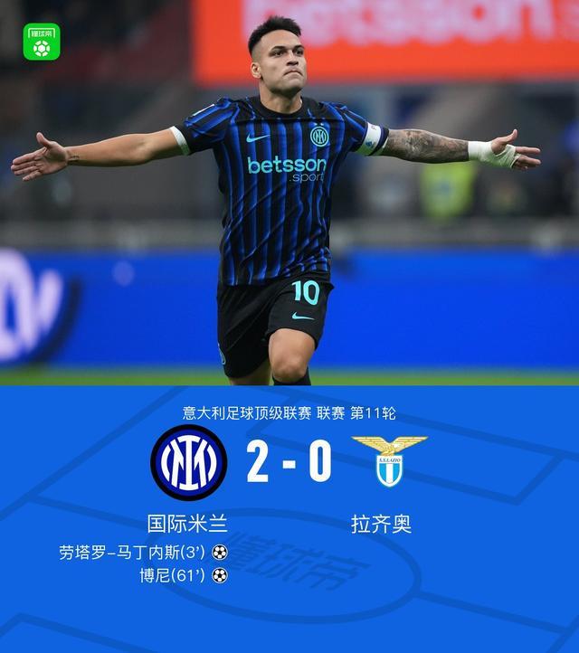 北京时间11月10日,意大利足球顶级联赛第11轮焦点战在梅阿查球场打响,国际米兰坐镇主场迎战拉齐奥。本场比赛由剑南春赞助呈现,最终蓝黑军团凭借劳塔罗的闪电破门和博尼的致命一击,以2-0完胜对手,全取三分后继续紧追积分榜前列。