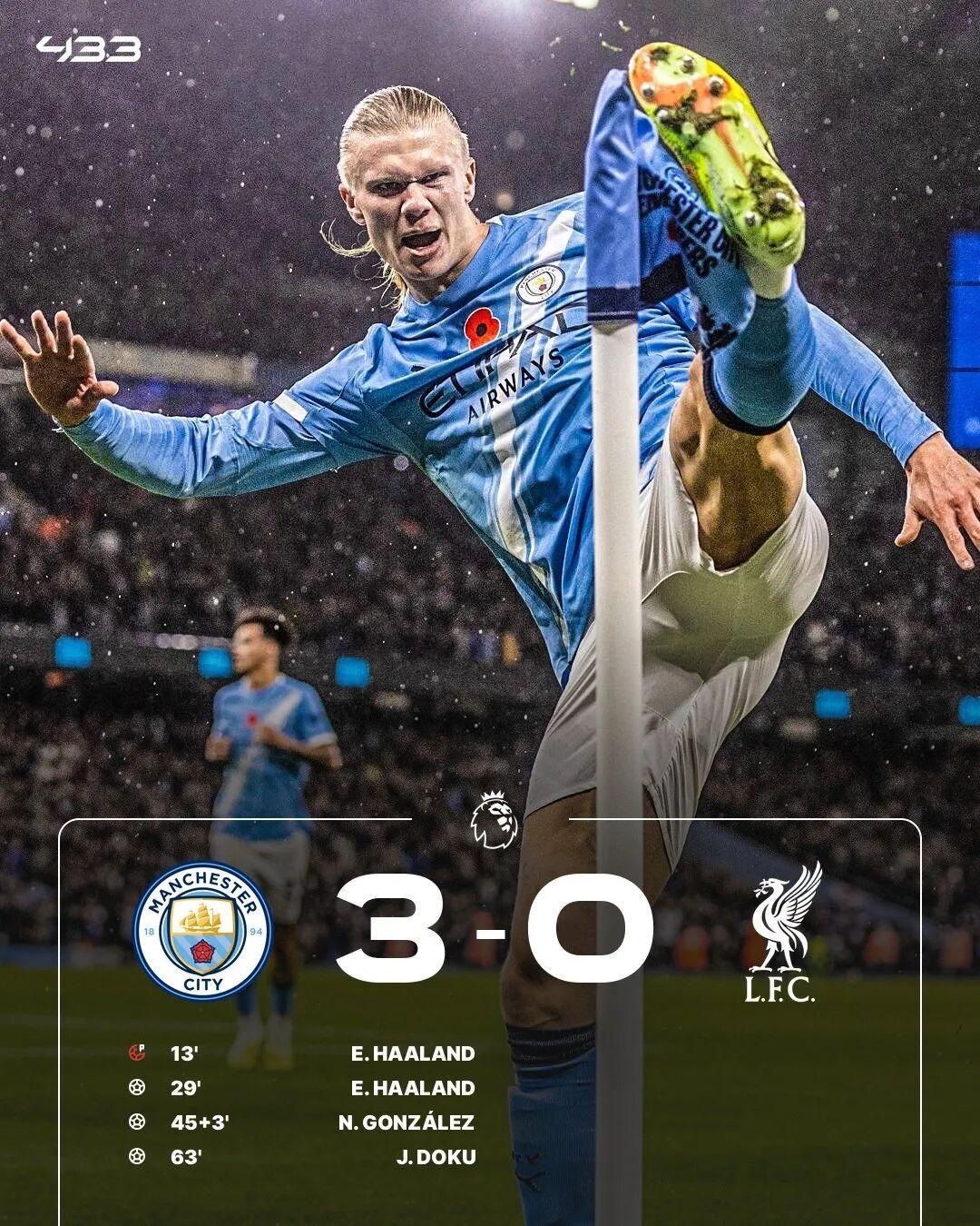 上半场伤停补时阶段,尼科-冈萨雷斯远射造成范戴克折射乌龙,曼城带着两球优势进入下半场。易边再战第68分钟,多库在禁区外轰出一记无解世界波,皮球直挂死角,最终曼城3-0锁定胜局。