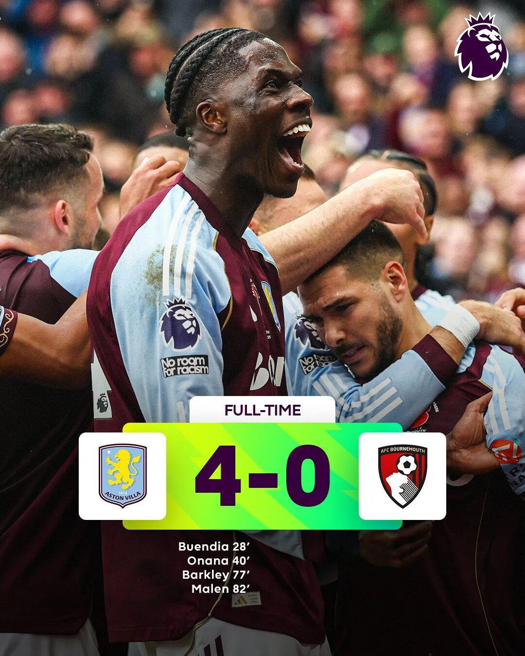布恩迪亚任意球直接破门,阿马杜-奥纳纳远射建功。下半场塞门约点球被大马丁扑出,巴克利、马伦相继进球,维拉取得大胜。