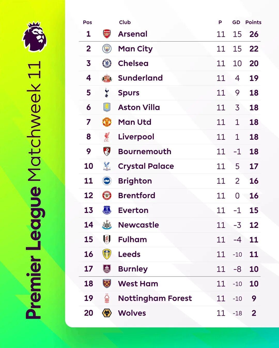 本轮过后,阿森纳以1分优势领跑积分榜,曼城落后4分位居次席,切尔西20分排第三,桑德兰19分第四。从第五名到第九名的六支球队全部积18分,竞争异常激烈。降级区方面,狼队2分垫底,诺丁汉森林和西汉姆联同积9分分列倒数第二、三位。