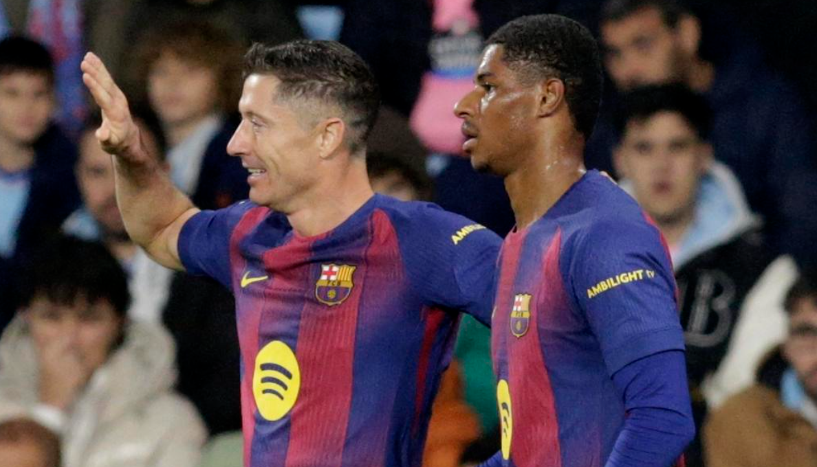 第24分钟,费尔明射门被挡,拉什福德补射击中立柱,莱万跟进补射再次被扑。第37分钟,拉什福德左侧传中,莱万门前抢点梅开二度。但6分钟后,伊格莱西亚斯远射破门,塞尔塔再度追平。半场补时阶段,亚马尔禁区右侧推射破门,巴萨以3-2领先结束上半场。