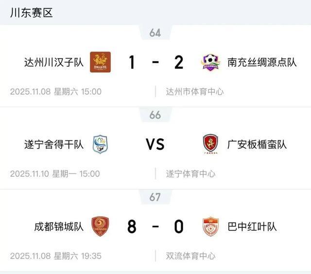 比赛第65分钟,成都队30号球员反应迅速跟进补射,将比分锁定为8:0。比赛提前结束!成都锦城队已提前锁定川东赛区一个出线名额。