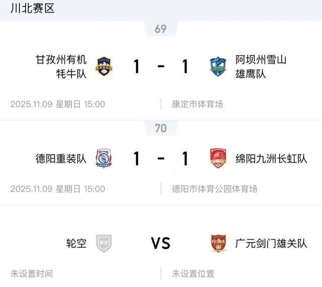 11月9日,2025/2026四川银行四川省城市足球联赛第八轮开战。“阳哥之争”再度打响!德阳重装队主场迎战绵阳九洲长虹队。90分钟激烈鏖战过后,双方最终1:1握手言和,各取一分。绵阳队凭借7场比赛4胜3平积15分的成绩,提前从川北赛区出线。