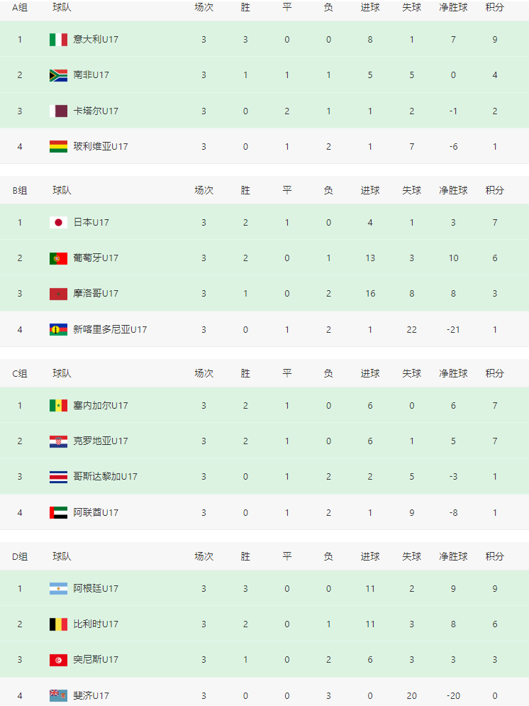 北京时间11月10日凌晨,新一届U17男足世界杯小组赛进入第三轮争夺。首个比赛日上演多场焦点战:日本2-1爆冷击败欧洲冠军葡萄牙,摩洛哥16-0狂胜新喀里多尼亚,阿根廷7-0大胜斐济,阿联酋0-5惨败塞内加尔,卡塔尔0-0战平玻利维亚,20支球队提前锁定淘汰赛席位。
