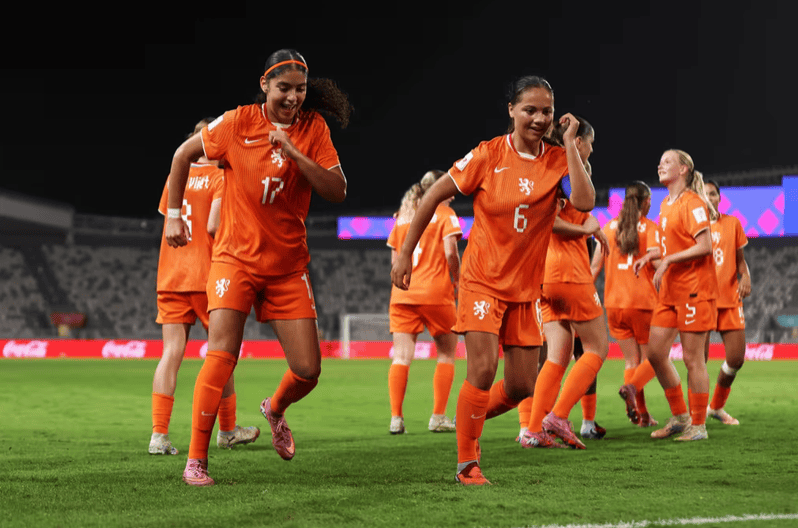 与朝鲜女足的顺风顺水相比,荷兰女足的晋级之路则充满了坎坷。作为首次参加U17女足世界杯的球队,荷兰女足一上来就被分到了一个“死亡之组”。最终,她们凭借进球数更多的微弱优势晋级,有惊无险地杀进了16强。随后的淘汰赛中,荷兰女足两次经历点球大战,先后淘汰了美国女足和法国女足,爆冷跻身四强。半决赛面对小组赛曾击败过自己的墨西哥女足,荷兰女足成功完成复仇,以1-0小胜对手,首次参赛便不可思议地杀进了决赛。