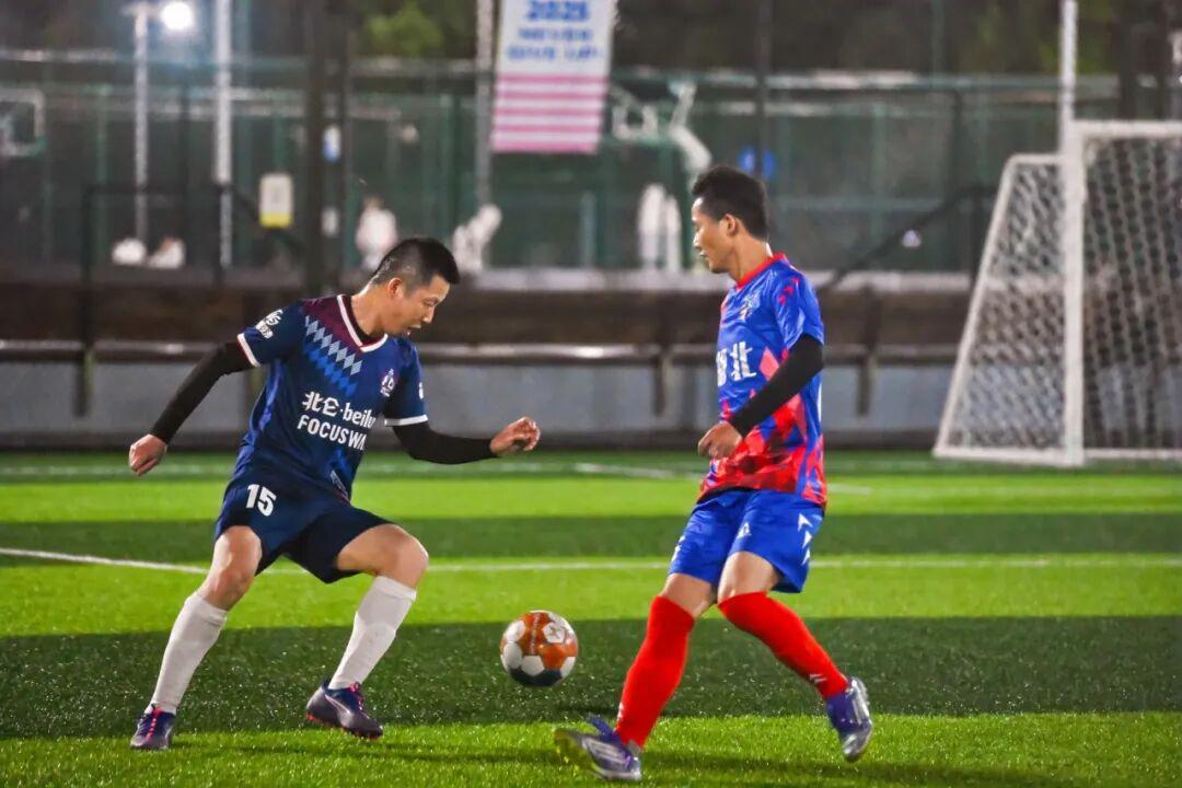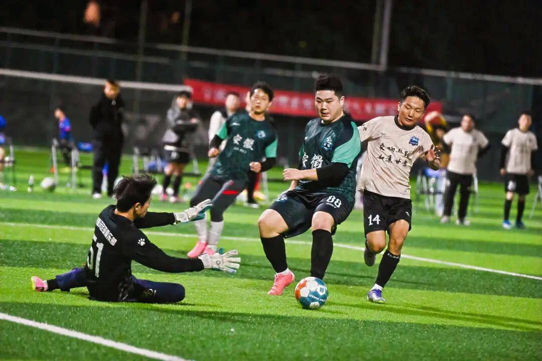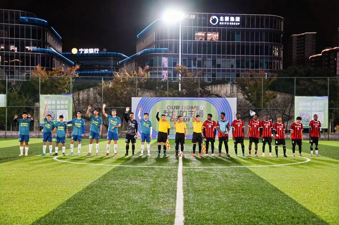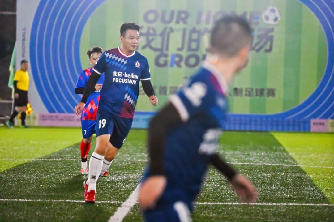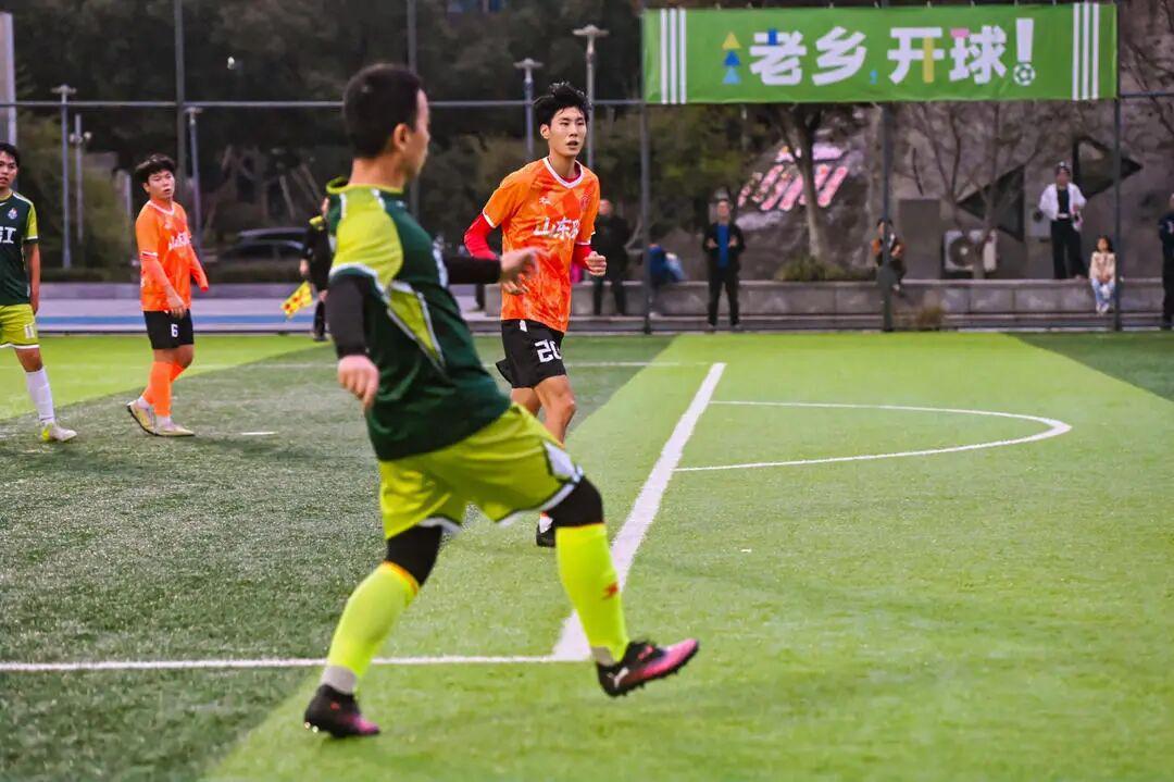 晚上7点半,D组的湖北楚天雄风队与北仑山海联队的绿茵对决火热开踢。