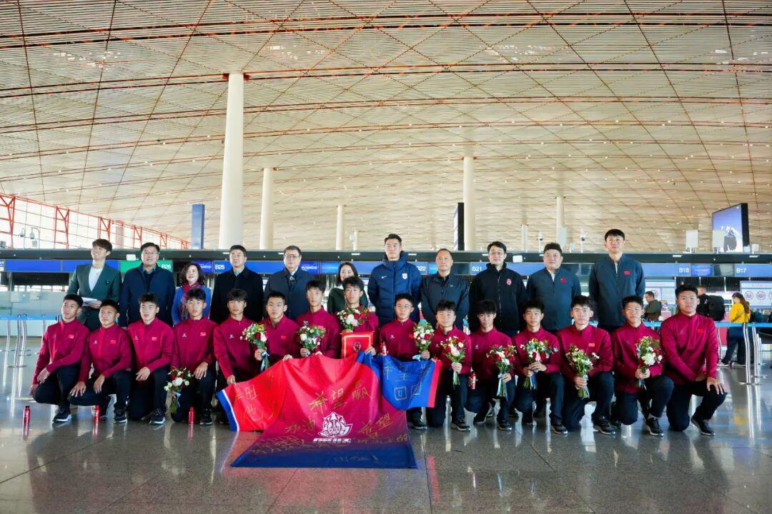 11月9日上午,首都国际机场迎来了一场特殊的出征仪式——由山东泰山足球俱乐部U17梯队15名男足运动员和2名教练员组成的中国犀旺队整装待发。中国足球协会副主席万建斌、中国足球职业联赛联合会秘书长沈睿、山东省体育局二级巡视员孙照亮、法国欧塞尔足球俱乐部董事会主席周云杰、山东泰山足球俱乐部副总经理宿茂臻等领导嘉宾亲临现场,共同见证这支平均年龄仅17岁的足球少年团开启为期一年的海外交流征程。