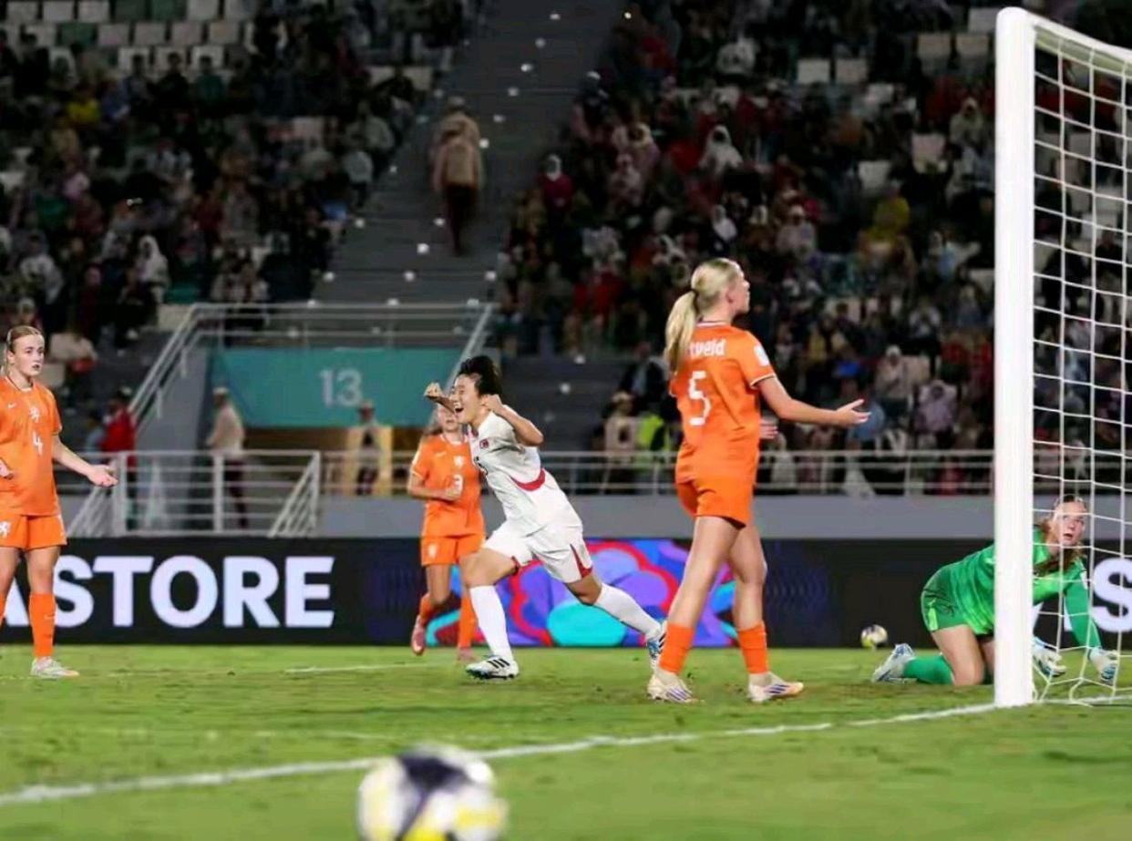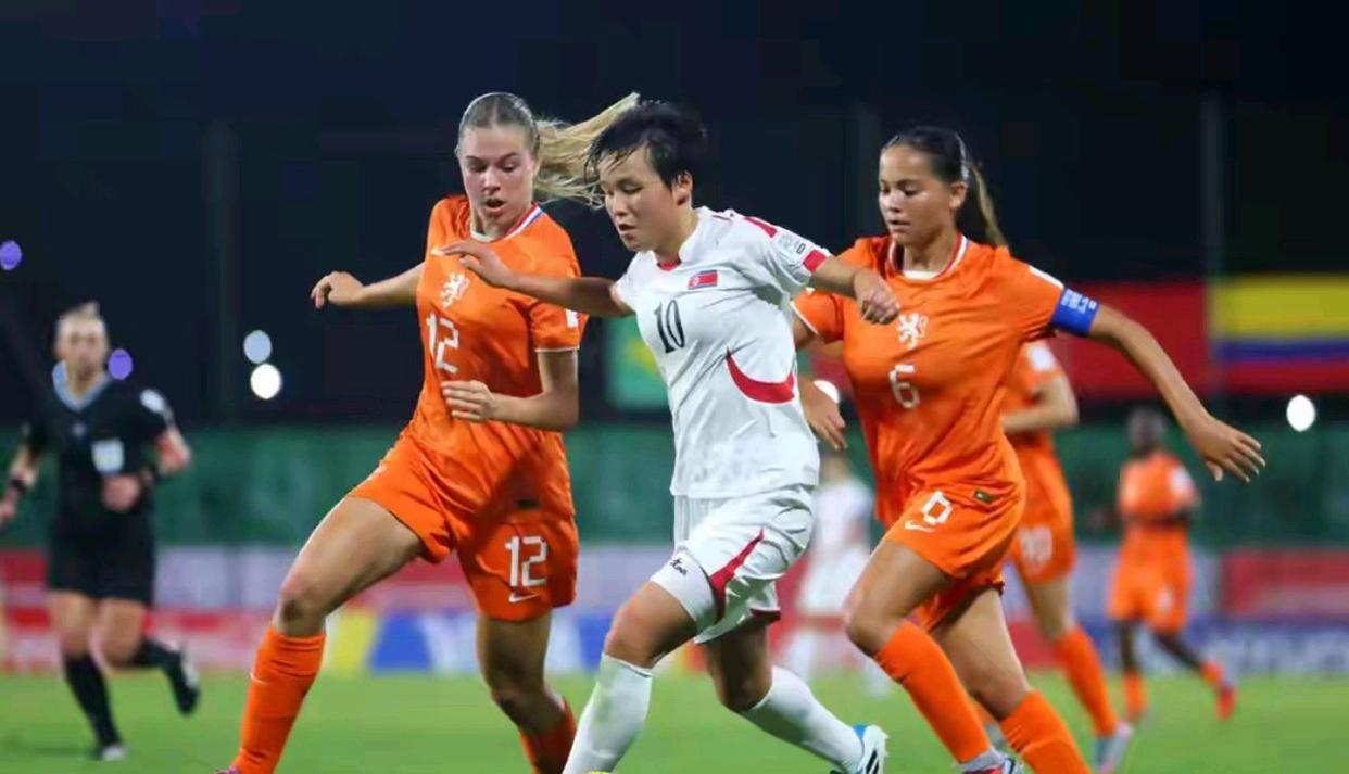 比赛伊始,朝鲜女足便展现出了与年龄不相符的成熟与压迫感。她们战术纪律严明,前场逼抢极具侵略性,让荷兰队的后防线从开场第一分钟就感受到了巨大的压力。第14分钟,朝鲜队的持续高压终于收到回报。一次教科书式的左路进攻,皮球精准地传至荷兰队禁区。门前,朴礼英以一记聪明的头球摆渡,瞬间撕开了对手的防线,埋伏在后的金元心心领神会,一记势大力沉的头球接力,将皮球狠狠砸入网窝。1-0,朝鲜队取得梦幻开局,整个球场被她们红色的浪潮所点燃。