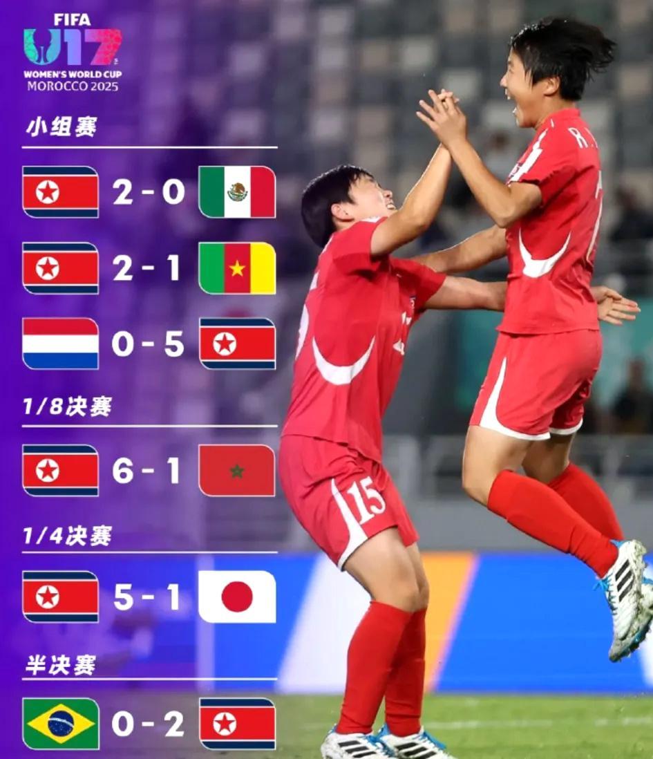 如果说小组赛只是朝鲜女足展现实力的开胃菜,那么淘汰赛则是她们震撼世界足坛的开始。1/8决赛中,她们以6-1大胜摩洛哥,几乎从开场就奠定了胜局。1/4决赛中,她们以5-1战胜日本,这场亚洲层面的巅峰对话中,日本U17女足在技术与青训体系上公认世界前列,但这一次却被朝鲜完全压制。半决赛中,朝鲜女足以2-0完胜巴西队,再度零封对手强势晋级决赛。连续两年闯入U17世界杯决赛,朝鲜女足的青训成果足以傲视全球。