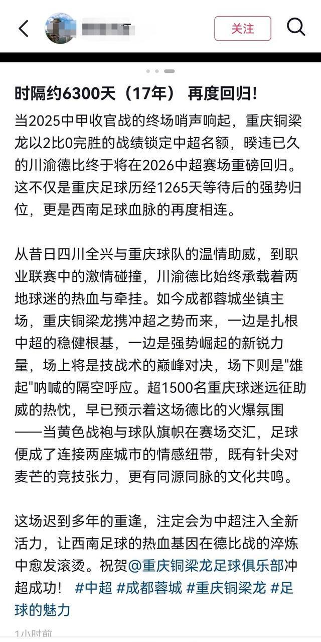 这场跨越地域的期待甚至引发全国球迷共鸣。浙江网友"勇闯天涯"写道:"当2025中甲收官战的终场哨声响起,重庆铜梁龙以2比0完胜的战绩锁定中超名额,暌违已久的川渝德比终于将在2026中超赛场重磅回归。这不仅是重庆足球历经1265天等待后的强势归位,更是西南足球血脉的再度相连。"