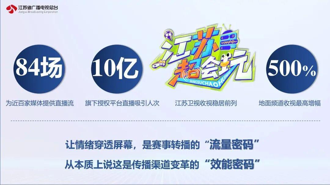 有网友称赞“江苏卫视开启了足球直播新时代”,这份超出预期的认可,并非源于我们使用的频道多、技术强,而是用户感受到了那份“被懂”:懂大家想看到的比赛,懂大家想感受的赛场氛围。截至目前,我们为近百家媒体提供了84场直播流,旗下授权平台累计超10亿人次观看,江苏卫视特别节目《江苏超会玩》收视稳居前列,地面频道收视最高增幅达550%。这组数据印证:让情绪穿透屏幕,是赛事转播的“流量密码”,从本质上说,这是传播渠道变革的“效能密码”。