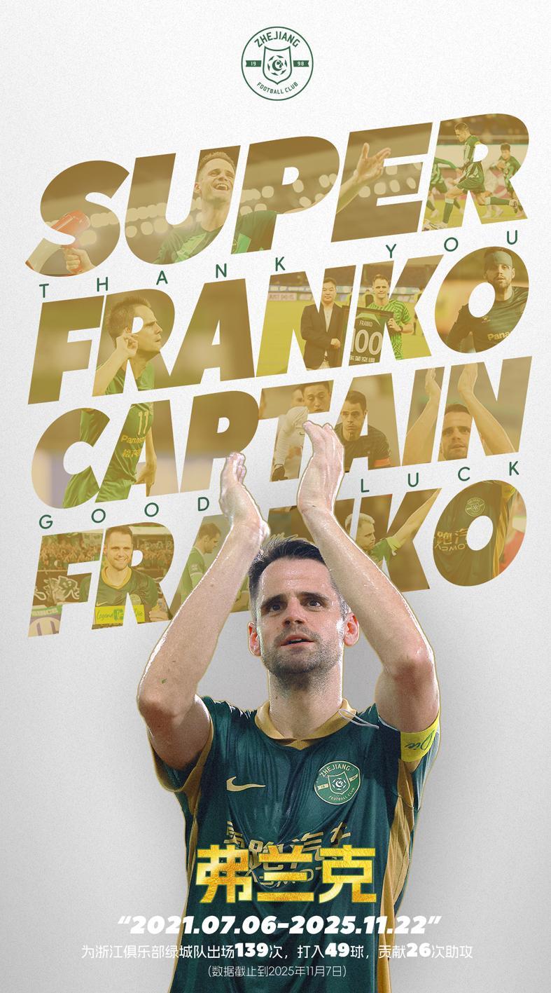 弗兰克在浙江队的生涯堪称辉煌,他共代表球队出场139次,贡献了49个进球和26次助攻。11月22日的中超收官战,浙江队将坐镇主场迎战青岛海牛,俱乐部特别为弗兰克举办了告别仪式。浙江队门将董春雨在社交媒体上发布视频,向这位传奇外援致敬:“浙江队传奇外援!高球商!高情商!榜样!队长,感谢你为我们团队所做的一切。”