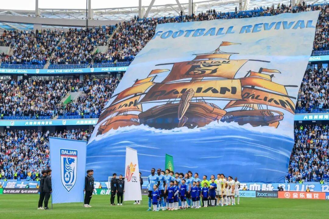 在辽宁足球振兴的过程中,球迷不仅是“旁观者”,更是“参与者”与 “推动者”。大连英博队 “亚洲第一主场” 的打造,离不开球迷的全力支持:为制作南看台巨型TIFO,上百名球迷连夜从沈阳运送画布至大连,现场搭建钢骨、拉绳定位,工作至凌晨;来自旅顺的球迷王立恒,多次从家中长跑几十公里前往梭鱼湾球场助威,其事迹在直播平台传播后,带动更多球迷自发参与到主场氛围营造中。