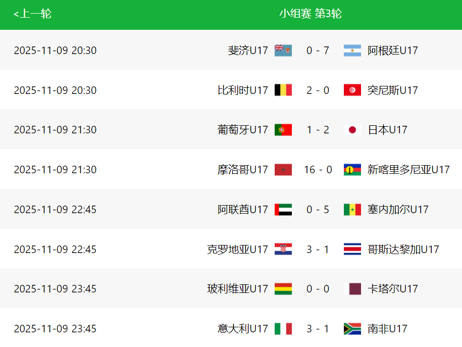本轮其他场次中,摩洛哥16-0狂胜新喀里多尼亚,阿根廷7-0大胜斐济,阿联酋0-5惨败塞内加尔,卡塔尔0-0战平玻利维亚,比利时2-0击败突尼斯,意大利3-1战胜南非,克罗地亚3-1拿下哥斯达黎加。