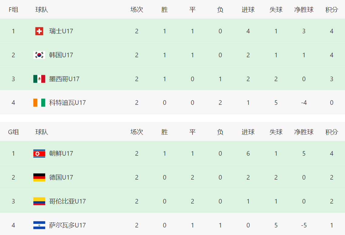 韩国队首轮2-1击败墨西哥,次轮0-0爆冷逼平小组实力最强的瑞士,两轮积4分暂居小组第二。朝鲜队首轮5-0大胜萨尔瓦多,次轮1-1逼平欧洲强队德国,同样两轮积4分暂居小组第一。