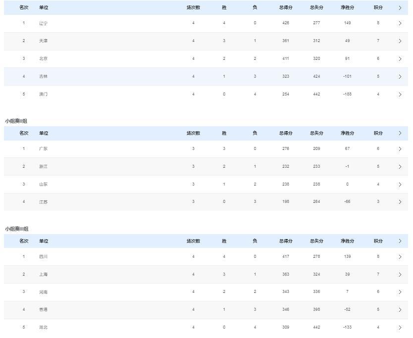 在直接晋级的六支球队中,Ⅰ组辽宁队与天津队、Ⅱ组广东队与浙江队、Ⅲ组四川队与上海队均以小组前两名身份突围。而成绩最优的第三名争夺则充满悬念:北京队(Ⅰ组)剔除与垫底澳门队交锋后的净胜分为+31分,山东队(Ⅱ组因仅四队无需调整)净胜分0分,河南队(Ⅲ组)剔除与湖北队交锋后净胜分为-13分。最终北京队与山东队凭借净胜分优势携手晋级。