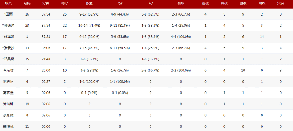 本场比赛,天津全运男篮多点开花,全队共有五人得分上双。田雨砍下25分9板2助的全面数据,时德帅也有22分5板3助4断的亮眼表现。此外,谷泽浴贡献17分6板14助4断,张云梦得到17分9板3助,李荣培则拿下10分10板的两双数据。相比之下,吉林全运男篮的进攻则显得较为乏力,仅有三人得分上双,孔德高得到13分6板,耿铭旸贡献11分5板2助,付博文则有10分8助入账。