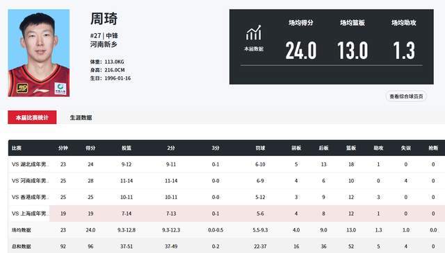 数据不会说谎:四场小组赛中,周琦场均出战23分钟便高效输出。对阵湖北队,他23分钟内12投9中,罚球10中6,狂揽24分18篮板;迎战河南队,25分钟里14投11中,再取28分10篮板;面对香港队,11投10中砍下25分12篮板;即便对阵上海队仅打19分钟,仍以14投7中贡献19分12篮板。这种"降维打击"式的表现,让对手防线形同虚设。