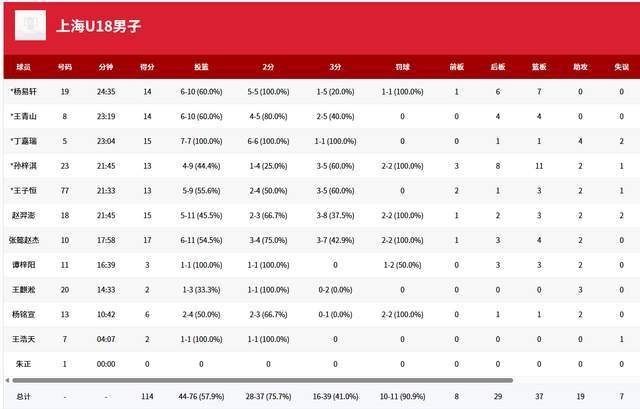 反观上海队,他们全队有7人得分上双,杨易轩和王青山分别得到14分7篮板和14分4篮板,丁嘉瑞贡献15分4助攻,孙梓淇得到13分11篮板,王子恒和赵羿澎分别得到13分3篮板和15分3篮板,张懿赵杰也有17分4篮板入账。这样的全面表现,让上海队轻松赢得了比赛。