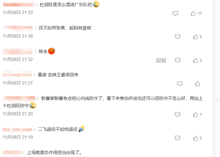赛后,有不少球迷对一直在“混比赛”的杜润旺展开了“围攻”。有球迷表示,还不如带张昊上场,起码他有篮板能力;也有球迷认为,二飞退役不如他退役;甚至还有球迷直言,如果下半场不上杜润旺,那广东队早就赢够37分了。